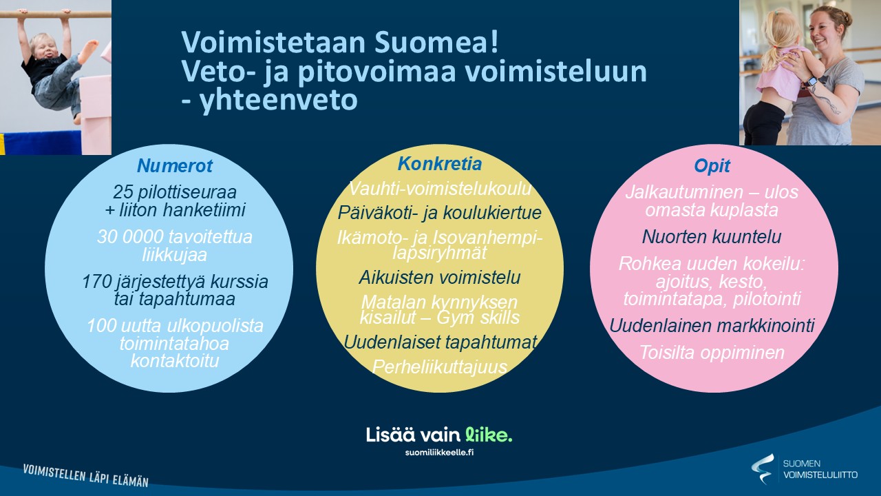 Opetus- ja kulttuuriministeriön Voimisteluliitolle myöntämästä valtionavustuksesta kohdennetaan taloudellista tukea edelleen jaettavaksi hanketta yhdessä toteuttaville Suomen Voimisteluliiton jäsenseuroille. Hankkeeseen valikoitui mukaan 26 pilottiseuraa. Hankkeessa kehitettävät toiminnot ovat kaikkien voimisteluseurojen hyödynnettävissä hankkeen päätyttyä.