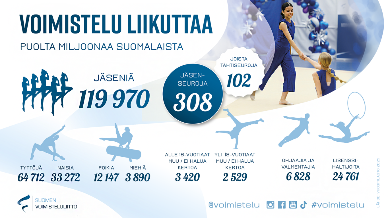 Voimisteluliiton jäsenseuroissa liikkuu noin 120 000 harrastajaa, mikä on 1,2 % vähemmän kuin vuosi sitten.