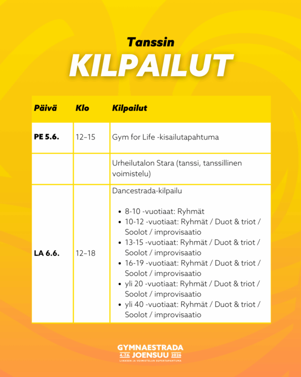 Kilpailuihin ilmoittaudutaan Gymnaestradan yhteisessä aikataulussa ja samalla tilataan osallistujapassit, mahdollinen koulumajoitus ja ateriapaketit. Sitovat ilmoittautumiset 3.2. mennessä (edullisemman Early Bird-hinnat). Ja huom: lisäksi ilmoittautuminen kilpailuun Kisanetissä 31.3. mennessä.