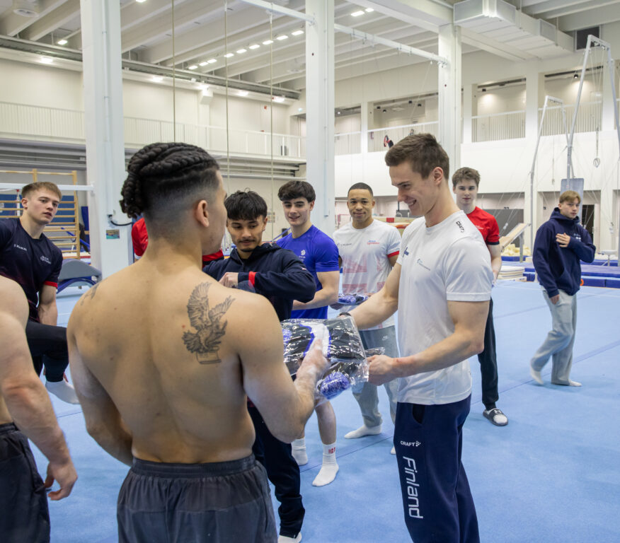 Miesten telinevoimistelun maajoukkue aloitti vuoden huippuseurassa, kun Iso-Britannian maajoukkue olympiatähtineen saapui Urheaan leireilemään. Kuva: Hilla Järvinen/Voimisteluliitto