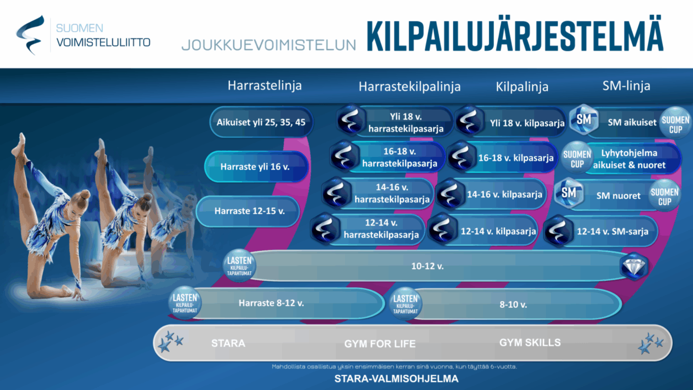 - 8–10-vuotiaiden ja 10–12-vuotiaiden sarjojen ja harrastesarjojen kilpailuita järjestetään joukkuevoimistelun Cup-kilpailuissa.