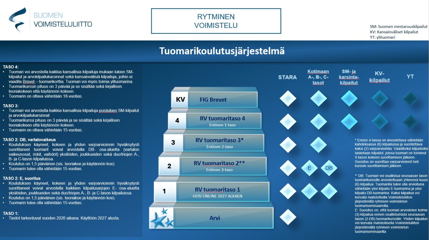 Rytmisen voimistelun kansallinen tuomarijärjestelmä on kolmitasoinen. Kouluttautuminen aloitetaan vuonna 2026 tasolta 2, joka on jaettu kahteen osaan (E ja DB). Vuonna 2027 järjestelmään tulee uutena taso 1, online-koulutus, joka on tarkoitettu uusille tuomareille.