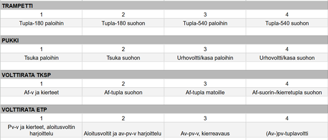 Harjoittelutavoitetaulukot