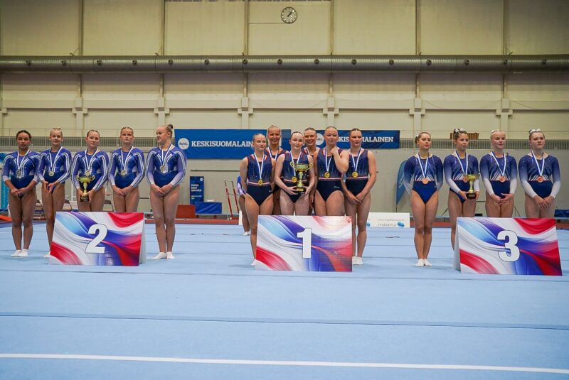 Jännitystä oli myös eilen perjantaina, kun SM-kisoissa kilpailtiin naisten telinevoimistelun nuorten sarjassa. Tyttöjen neliottelun kirkkain mitali ripustettiin Kiira Jokisen (Jyväskylän Voimistelijat) kaulaan. Jokinen voimisteli neliottelussa yhteispisteet 46,200, kun taas SM-hopeaa voimistellut Olivia Vättö (Espoon Telinetaiturit) sai pisteitä 46,150. SM-pronssia tyttöjen neliottelussa otti Sofia Kivekäs (Espoon Telinetaituri) pistein 46,050.